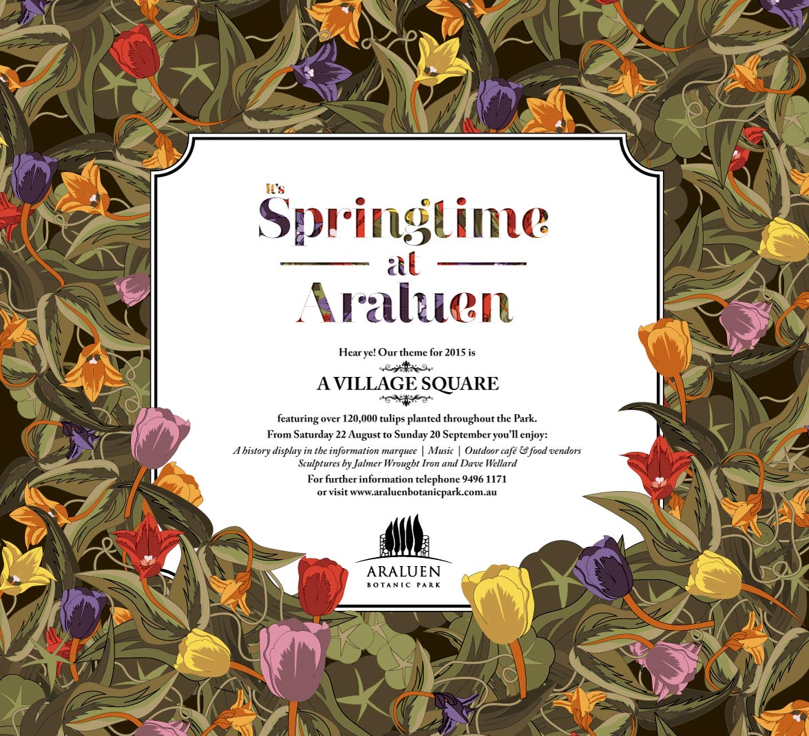 Araluen Botanic Park asked us to produce a campaign advertising their Spring tulip festival. We channelled our inner William Morris and drew up this floral design.